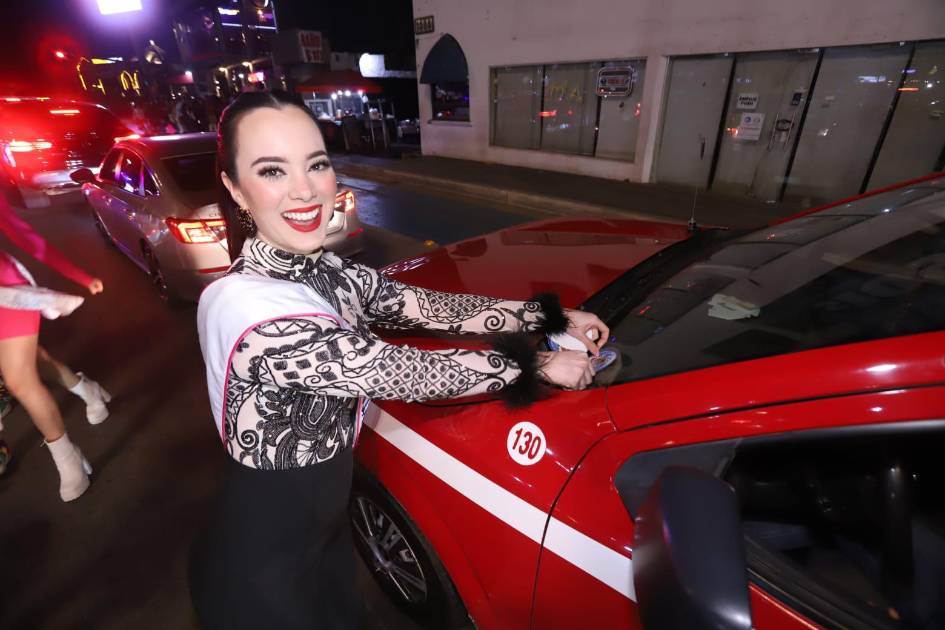 Las 10 bellas candidatas del Carnaval, Jasaret Álvarez Díaz, Aspasia Cárdenas Portillo, Irene Guadalupe Rojas Alcaraz, Mónica Georgina Vázquez Veytia, Rubí Carolina Mondragón Madrigal, Samantha Espinosa Osuna, Andrea Elizabeth García Navarro, Catalina Castellanos Osuna, Carolina Pano Ruelas y Siu Ling Cotero Chío, se acercaron a las ventanillas de los automóviles para solicitar a los conductores pegar en su vehículo una calcomanía de Eclipse Barroco, nombre que define el tema del Carnaval 2024.