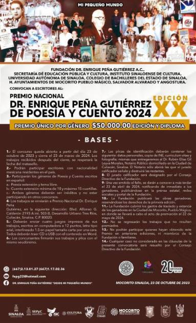 Quedan pocos días para que cierre la convocatoria que lanzó la Fundación Dr. Enrique Peña Gutiérrez A.C. para escritores de todo el país a que participen en el Premio Nacional Dr. Enrique Peña Gutiérrez de Poesía y Cuento en su vigésima edición.