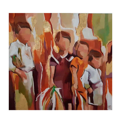Un cuadro en especial llama la atención por la composición que se acerca mucho a la abstracción, su líneas y matices consiguen un equilibrio óptico que genera una experiencia de armonía. El cuadro se llama Encuentro.