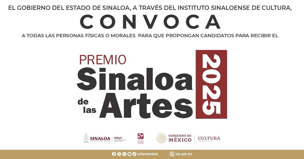 El Gobierno de Sinaloa, a través del Instituto Sinaloense de Cultura, invita a personas físicas o morales a proponer personas candidatas para recibir el Premio Sinaloa de las Artes 2025, para reconocer y premiar a las y los sinaloenses que, por sus méritos, han contribuido con su obra creativa al enriquecimiento del patrimonio cultural y al progreso del arte en la entidad o fuera de ella.