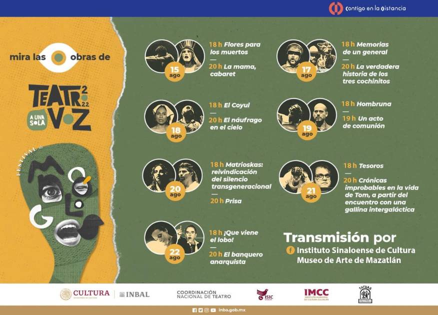 A partir de este lunes 15 y hasta el lunes 22 de agosto, en dos horarios por día, se estarán transmitiendo en línea las 13 obras de teatro que participaron en la décima séptima edición del Festival del Monólogo Teatro a una Sola Voz 2022, convocado por la Coordinación Nacional de Teatro del INBAL, con apoyo de instituciones de cultura de estados y municipios participantes.