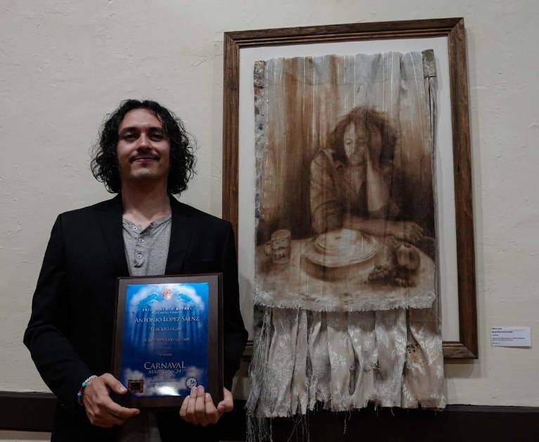 Con su obra Pareidolia (fenómeno psicológico que le permite a los humanos ver rostros, caras o figuras humanas en cualquier superficie o área), Mateo Gutiérrez “MAT” obtuvo el Tercer Lugar en el 23 Premio Bienal “Antonio López Sáenz” de las Artes Plásticas. Pareidolia esta pintada con una infusión de colillas de cigarro y hollín (subproducto de la combustión incompleta de materiales orgánicos, carbono) de transporte público sobre telas de cortinero.