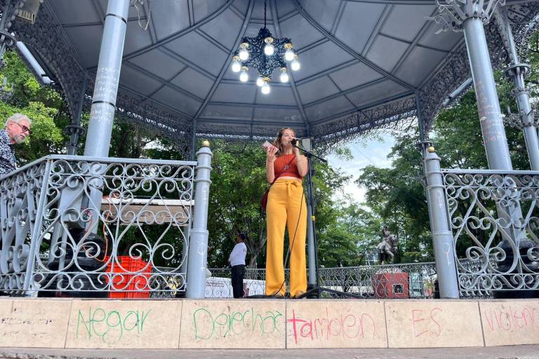 Así, los poemas, la “Poesía a los cuatro vientos” que nuestros poetas locales lanzan desde el kiosco de la plazuela Obregón, se van colando gota a gota en los edificios, sobre Catedral, en los resquicios de la fachada de una tienda de telas, en las alas de las palomas que sobrevuelan todo el espacio, se desplazan en los autos y los camiones, en el paso a paso de las personas caminando por la plaza o cruzando la calle, se van los poemas con ellos en sus oídos, ¿en su corazón?