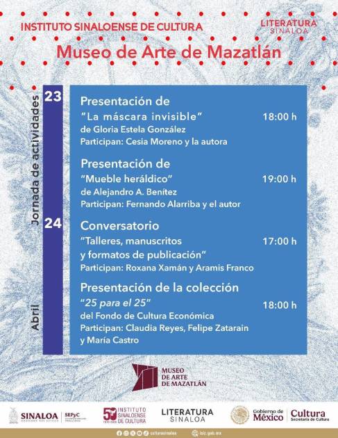 En el marco de las actividades de fomento a la lectura y difusión del quehacer literario en la entidad, el Instituto Sinaloense de Cultura, a través de Literatura Sinaloa, ha preparado una jornada cultural los días 23 y 24 de abril en el Museo de Arte de Mazatlán, con presentaciones de libros y espacios de reflexión en torno a la escritura.