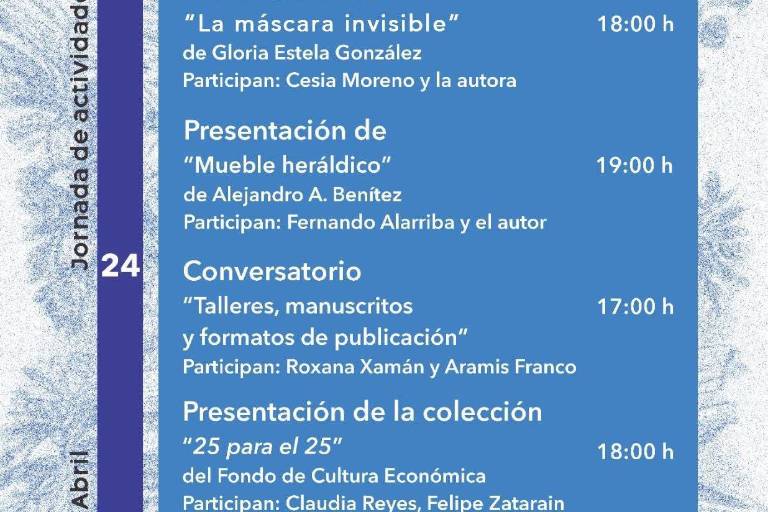 El programa inicia el 23 de abril a las 18:00 horas con la presentación de La máscara invisible, obra de Gloria Estela González, en la que participará la escritora acompañada por Cesia Moreno.