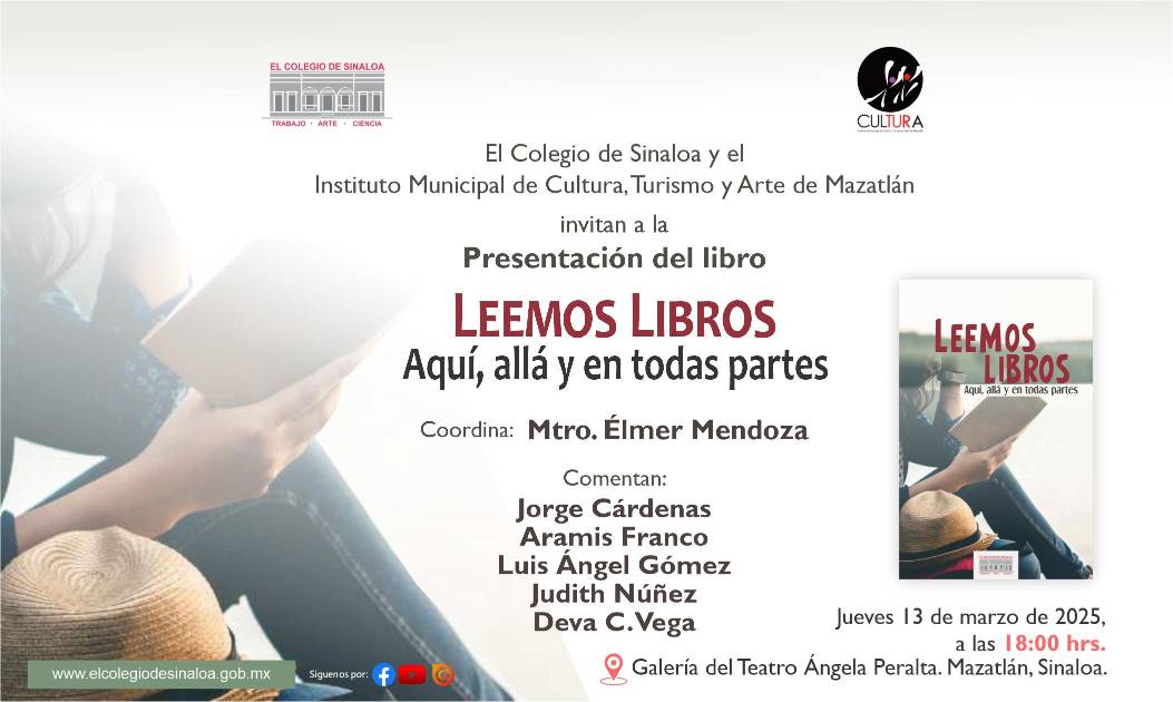 El Colegio de Sinaloa extiende una invitación a la presentación de su novedad editorial: Leemos libros. Aquí, allá y en todas partes, a realizarse el jueves 13 de marzo del año en curso, a las 18:00 horas, en la Galería del Teatro Ángela Peralta del puerto de Mazatlán. La actividad es de entrada libre.