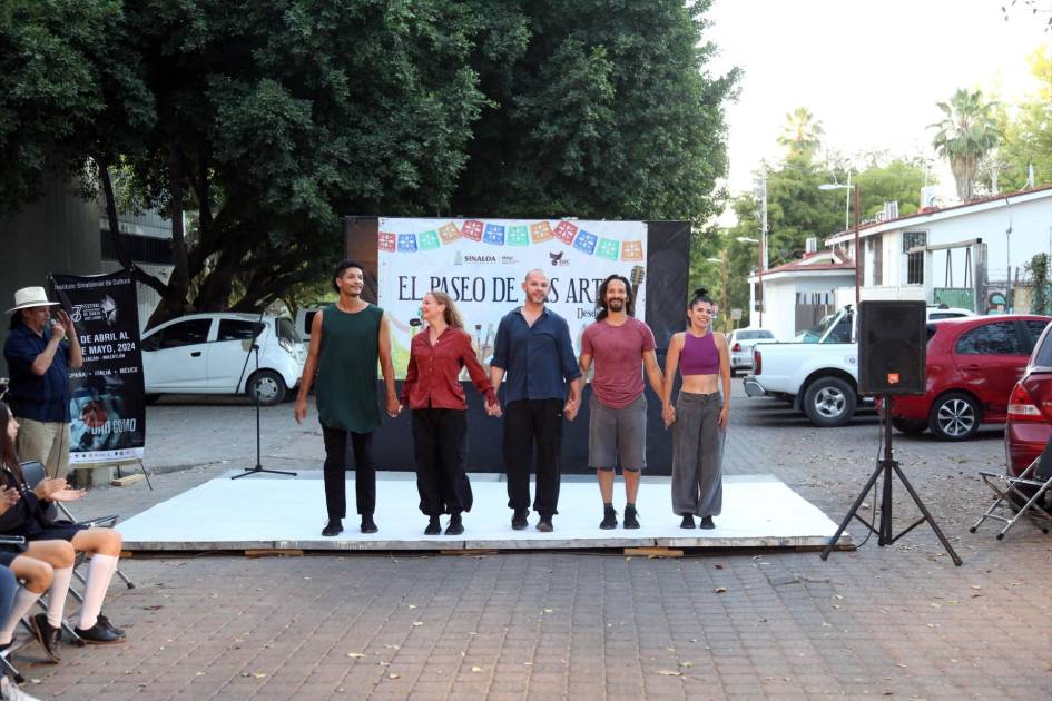 Rodeados de los artesanos y expendedores de diversos artículos que semana a semana se dan cita en el espacio coordinado por el promotor cultural José Alfonso Flores Carrasco, los bailarines presentaron un fragmento del trabajo que están realizando fruto de un proyecto de elevación compartida en pareja coordinado por Marion Sparber y que presentarán en conjunto el próximo martes, a las 19:30 horas, en el Museo de Arte de Sinaloa, durante la entrega del Premio Nacional de Danza José Limón.