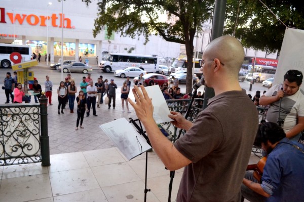 Y así sorprendieron a los transeúntes, Luis Dellamary, acompañado por Koki en la guitarra, leyó un fragmento de Altazor, de Vicente Huidobro; Adriana Quiroz leyó Hablo, del sinaloense César Cañedo.