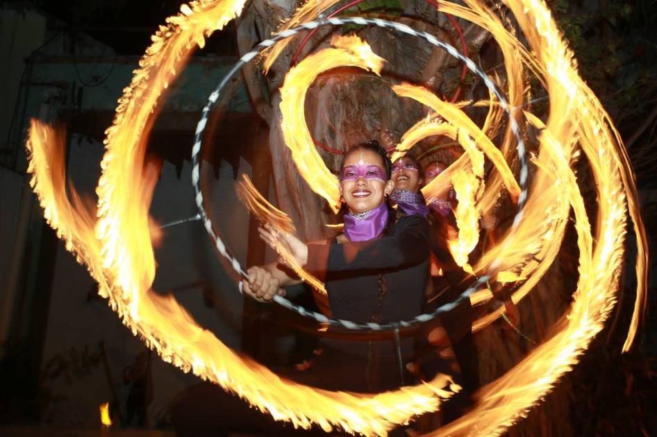 A partir de las 19:00 horas comenzaron las artes escénicas con aros de fuego interpretado por Rebecca, potlach con Damayanti González y Hula Hoop LED con Sara Brady, y finalmente se cerró esa sección con un performance de Rhene. A las 20:15 horas comenzaron las lecturas con el tema del amor romántico, de parte de Anayanci de la Rosa y lectura de poesía con Gloria Manyula.
