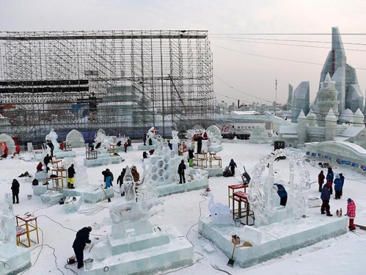 Los mejores escultores de Harbin se afanaban en dar los últimos retoques a sus creaciones, elaboradas a partir de que los grandes bloques de hielo que se sacan de un río cercano para darles forma e iluminarlas.