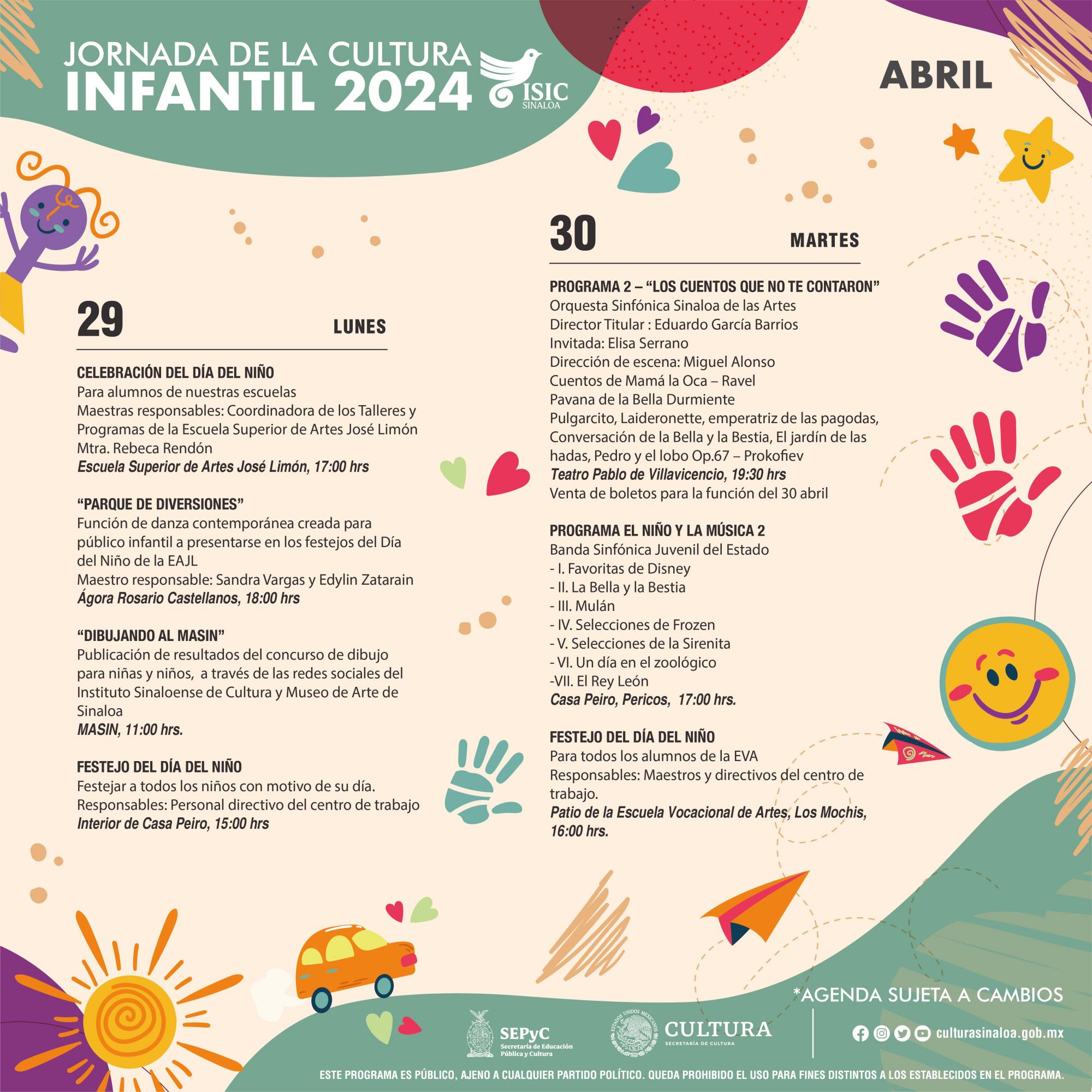 El lunes 29, desde las 17:00 horas, en la Escuela Superior de Artes José Limón, se llevará cabo la Celebración del Día del Niño para alumnos de nuestras escuelas, y a las 18:00 horas, en el Ágora Rosario Castellanos se presenta la coreografía Parque de diversiones, función de danza contemporánea creada para público infantil, mientras que el Museo de Artes dará a conocer a las 11:00 horas, los resultados del concurso de dibujo para niñas y niños Dibujando al MASIN, a través de las redes sociales del ISIC y Museo de Arte de Sinaloa. También en Casa Peiro se festejará a los niños que acuden a sus cursos.