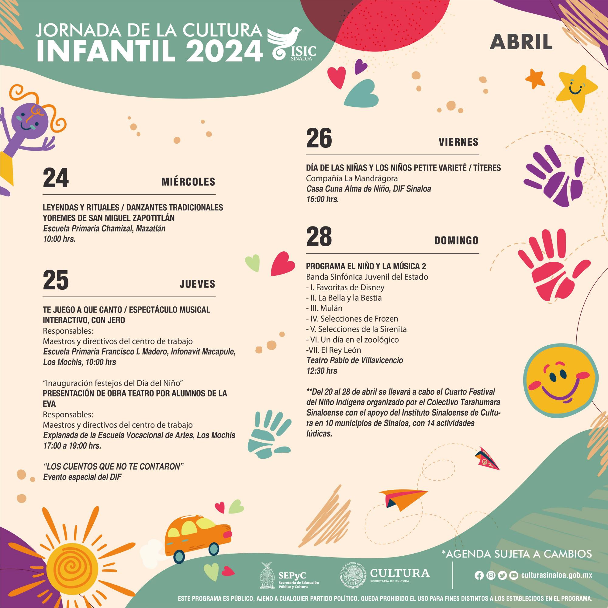 Actividades recreativas y artísticas en centros culturales en la entidad, llevará a cabo el Instituto Sinaloense de Cultura para celebrar del Día del Niño, a partir de este miércoles 24 hasta el 30 de abril-