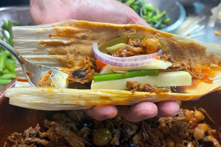 Para ellas, créame, no había nada mejor que tener sobre el mesón la cacerola con el picadillo de carne de puerco, aderezado con adobo de chiles guajillo y colorado, aceitunas enteras, pasitas y garbanzos. Además hacían una hilera con bandejitas en las que acomodaban, por separado, las verduras crudas en bastones, que aún les dan distintivo a los originales tamales de puerco sinaloenses, que también les dicen tamales arcoíris porque, al abrirlos, tus ojos se llenan con los colores de las tiras de tomate, cebolla, zanahoria, calabaza, chile poblano, ejote, papa y jalapeños.