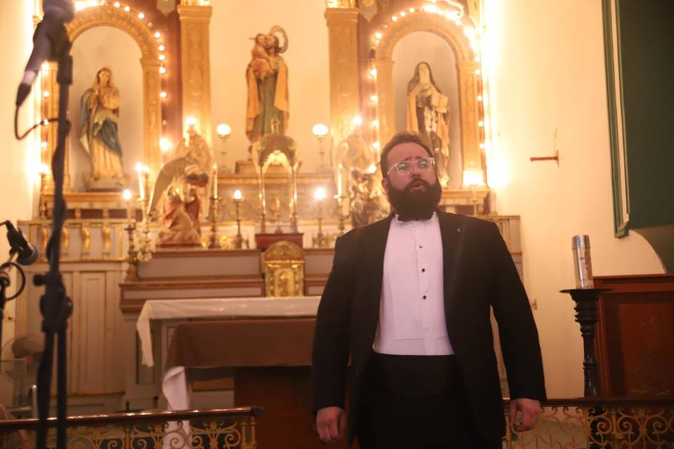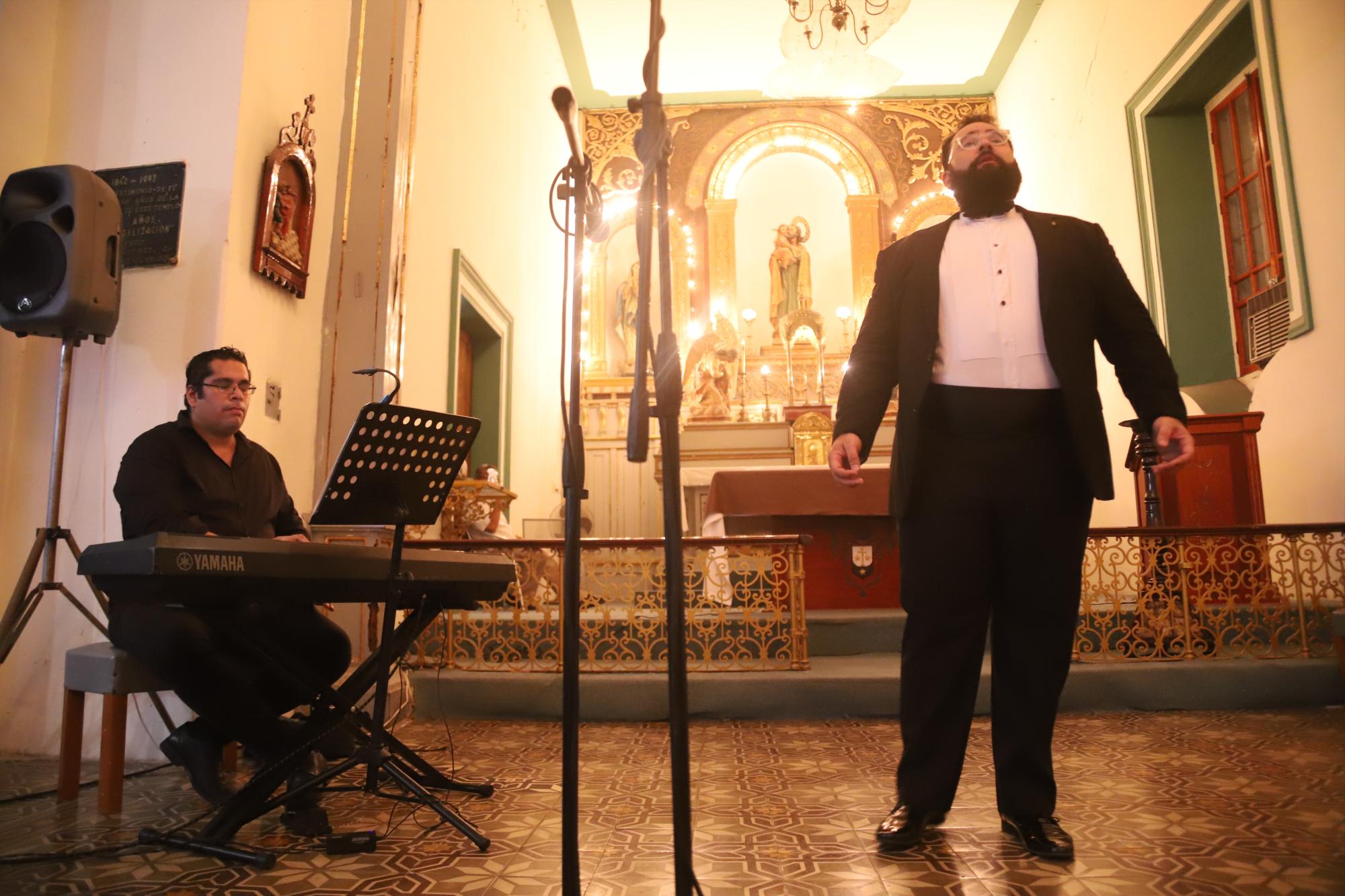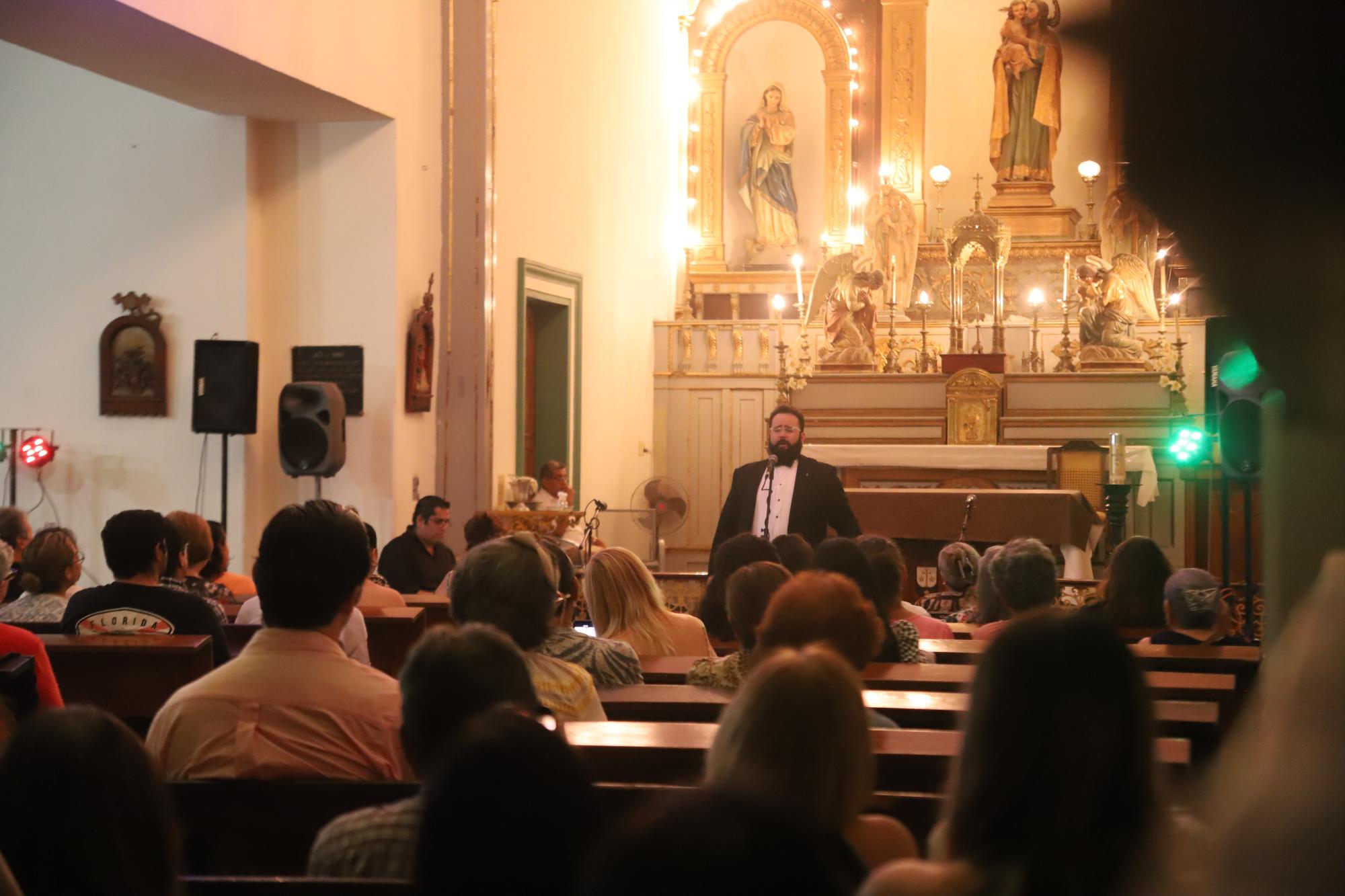 De la primera parte de su recital destacaron arias de la ópera como Recóndita armonía, Porquoi me reveiller, Addio fiorito asil, La roca fría del calvario, No puede ser y Nella fantasía, para deleite de los ahí presentes en el improvisado escenario frente al altar del recinto.