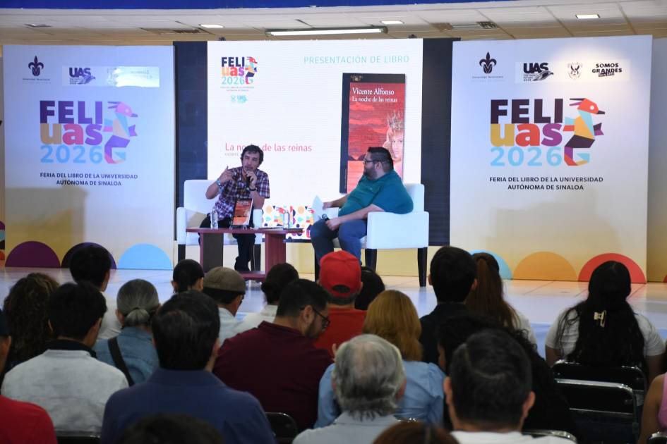 En el marco de la FeliUAS 2026, se llevó a cabo la presentación de la obra La noche de las reinas, del escritor Vicente Alfonso, quien ofreció una mirada distinta sobre los certámenes de belleza al entrelazarlos con contextos políticos y sociales.
