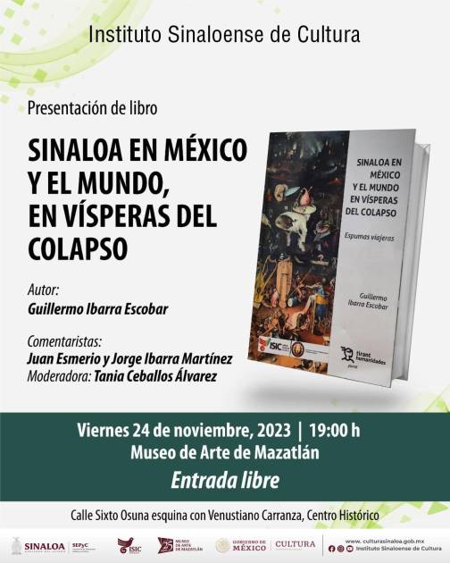 El investigador y escritor Guillermo Ibarra Escobar presentará este viernes 24 de noviembre su nuevo libro “Sinaloa en México y el mundo, en vísperas del colapso”.