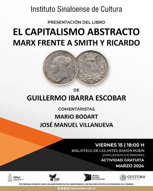 "El capitalismo abstracto” un libro, en el que el investigador Guillermo Ibarra Escobar aborda la teoría del valor y los precios en Smith, Ricardo y Marx, como hilo conductor para comprender el mecanismo articulador de la estructura y dinámica de la economía moderna, que llama capitalismo abstracto, se presentará el viernes 15 de marzo, a las 18:00 horas, en la Biblioteca de las Artes Ramón Rubín, en Mazatlán.