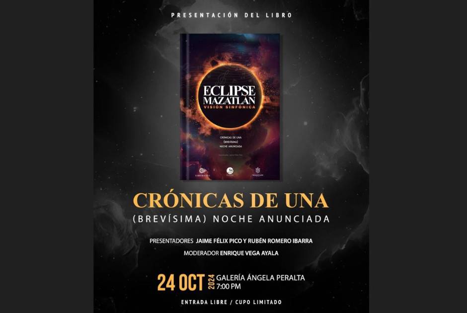 Este jueves 24 de octubre, a las 19:00 horas, se llevará a cabo la presentación del libro “Eclipse Mazatlán: Crónicas de una (brevísima) noche anunciada” en la Galería Ángela Peralta.