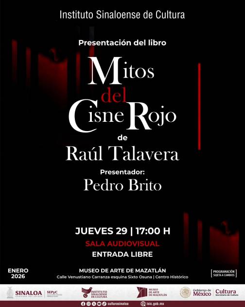 “Mitos del Cisne Rojo”, del destacado narrador y dramaturgo Raúl Ángel Talavera Juárez, se presentará el jueves 29 de este mes, a las 17:00 horas, en la sala audiovisual del Museo de Arte de Mazatlán.