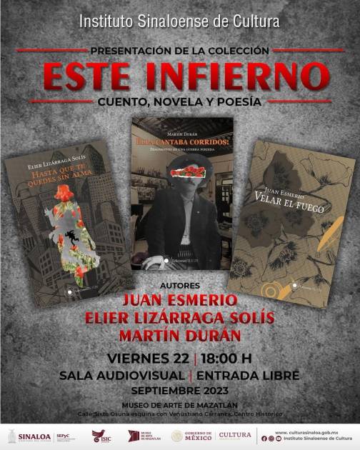 La colección de libros Este infierno, editados por Ediciones del Olvido y escritos por los sinaloenses Martín Durán, Juan Esmerio Navarro y Elier Lizárraga, se presentarán el viernes 22 de septiembre, a las 18:00 horas en el Museo de Arte de Mazatlán.