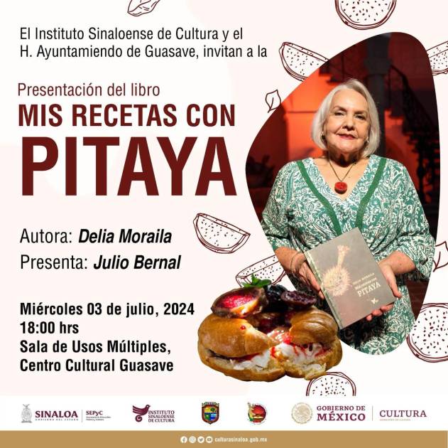 El libro Mis recetas con pitaya, de Delia Moraila, que reúne alrededor de 50 recetas de comidas, postres, bebidas, salsas, etcétera, con base en el fruto de la pitaya, se presentará este miércoles, a las 18:00 horas, en la Sala de Usos Múltiples del Centro Cultural Guasave, con los comentarios de Julio Bernal.