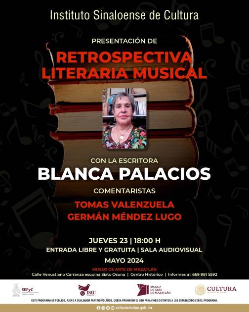 Un paseo por la obra publicada de la escritora Blanca Nieves Palacios se reúne en el libro Retrospectiva Literaria Musical, que se presentará el jueves 23 de mayo, en el Museo de Arte de Mazatlán, a las 18:00 horas.