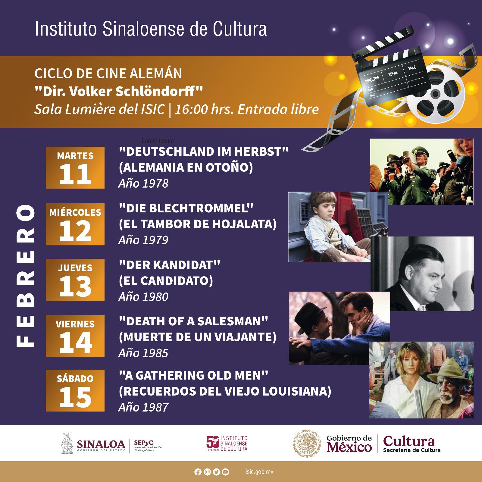A partir de este martes 11 y hasta el 22 de febrero, se proyectará en la Sala Lumière del Instituto Sinaloense de Cultura el Ciclo de Cine Alemán, con diez de las mejores películas del director de cine, guionista, productor, documentalista y actor alemán Volker Schlondorff.