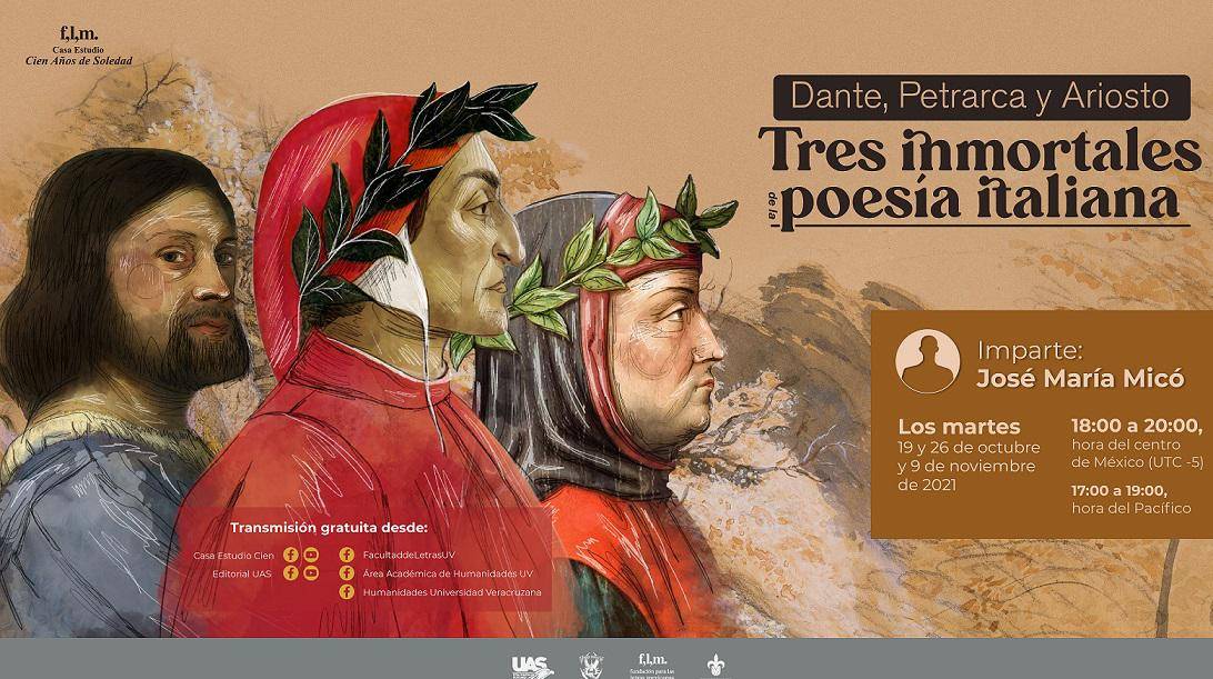 La casa Estudio Cien Años de Soledad recordará a tres obras inmortales de la poesía italiana: La Comedia, de Dante; El Cancionero, de Petrarca, y Orlando furioso, de Ludovico Ariosto, con una serie de charlas que se transmitirán por las redes sociales los martes 19 y 26 de octubre y el 9 de noviembre, de 18:00 a 20:00 horas,