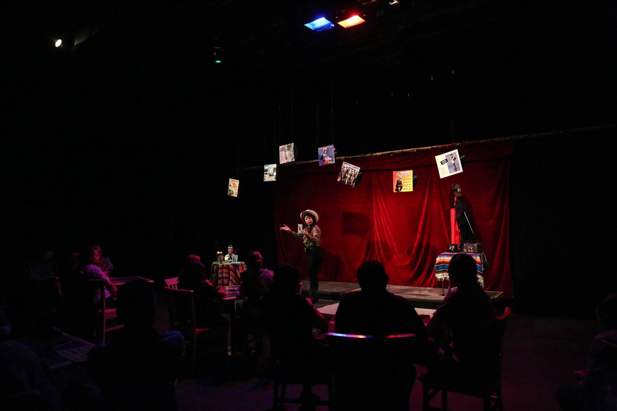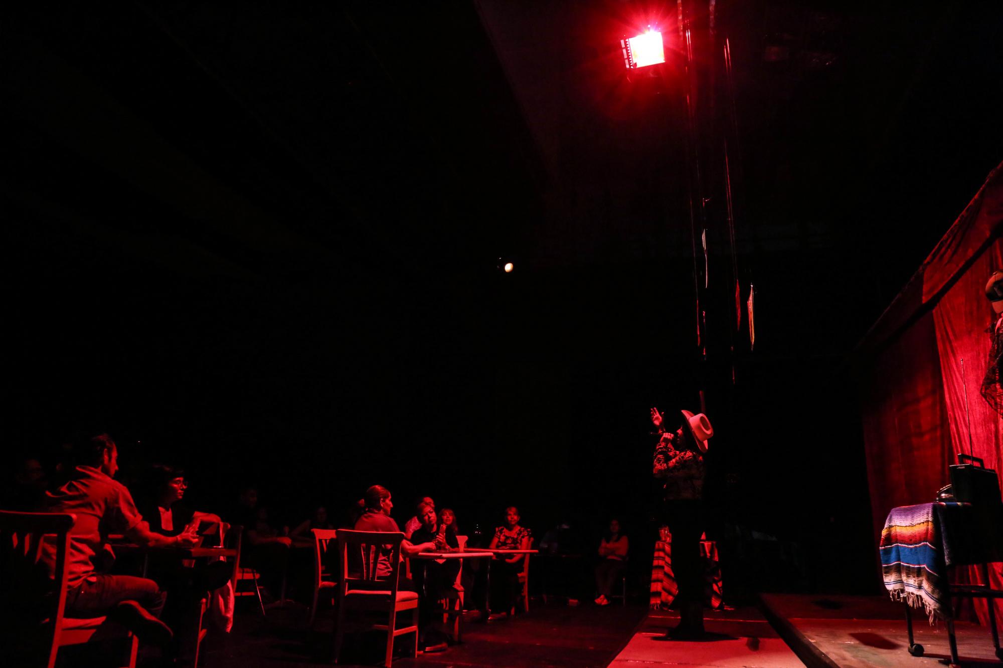 El escenario evoca una cantina, con sus mesas y sillas y el público sentado. -