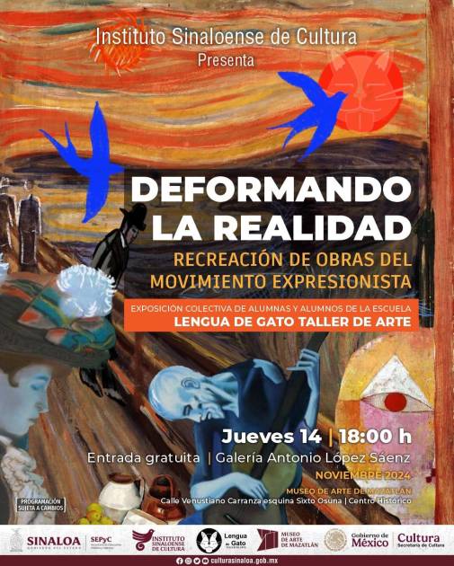 Organizado por El Instituto Sinaloense de Cultura y el Museo de Arte de Mazatlán, la expo “Deformando la realidad, recreación del movimiento expresionista”, reúne los trabajos de 39 alumnos del taller de arte “Lengua de Gato”, que dirige Rofelda González.