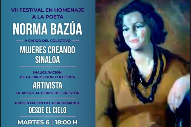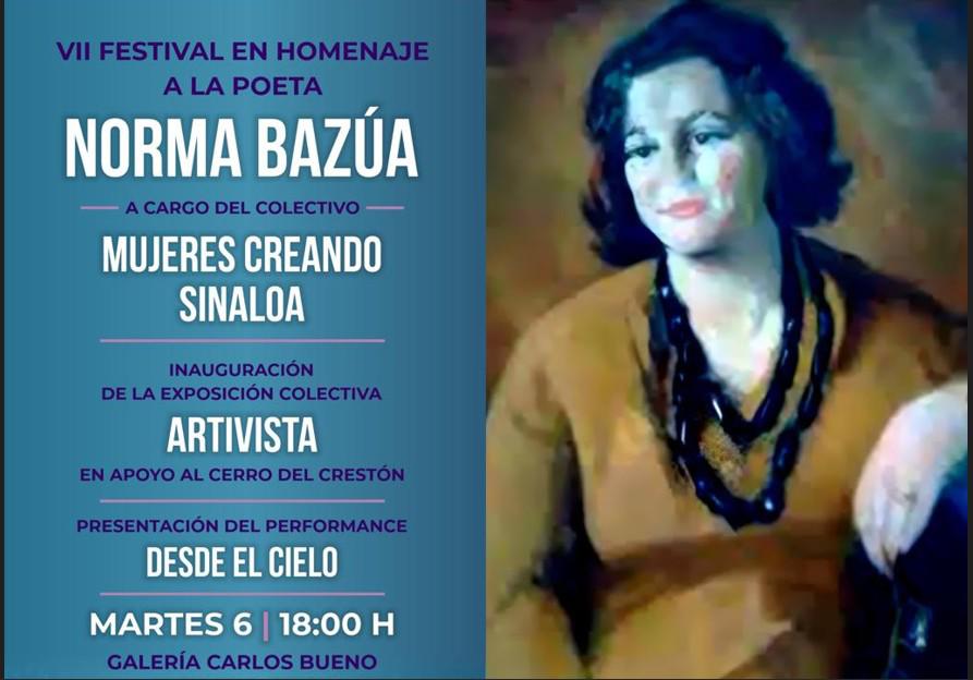 El colectivo Mujeres Creando Sinaloa, en el VII Festival en torno al Día Internacional de la Mujer, rendirán homenaje a la poeta sinaloense Norma Bazúa, el 6 de mayo, a las 18:00 horas en el Museo de Arte de Mazatlán. Entrada libre y gratuita.