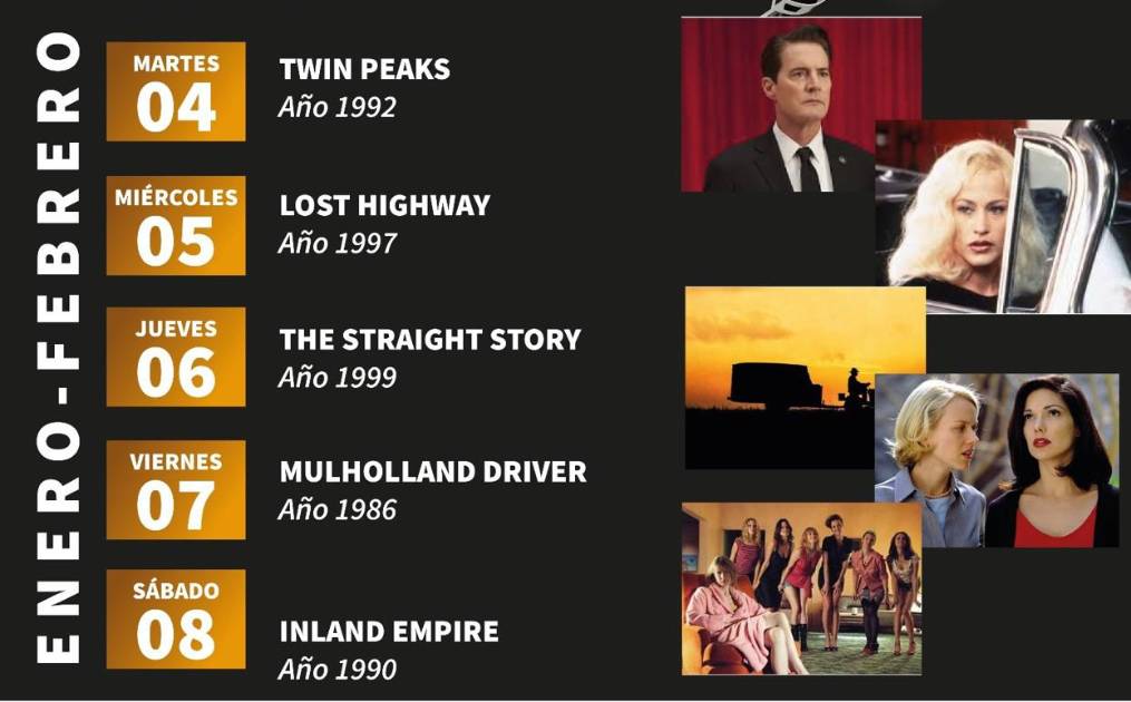 El ciclo continúa con los filmes Twin peaks (1992), este martes 4; Lost highway (1997) el miércoles 5; The straigth story (1999), el jueves 6; Mulholland driver (1986), el viernes 7, y Inland Empire (1990), el sábado 8.