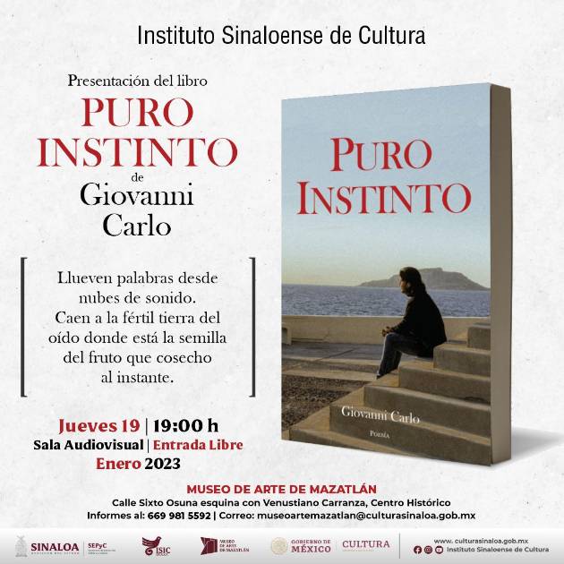 El libro Puro instinto de Giovanni Carlo se presentará el próximo jueves 19 de enero, a las 19:00, horas en la Sala Audiovisual del Museo de Arte de Mazatlán.