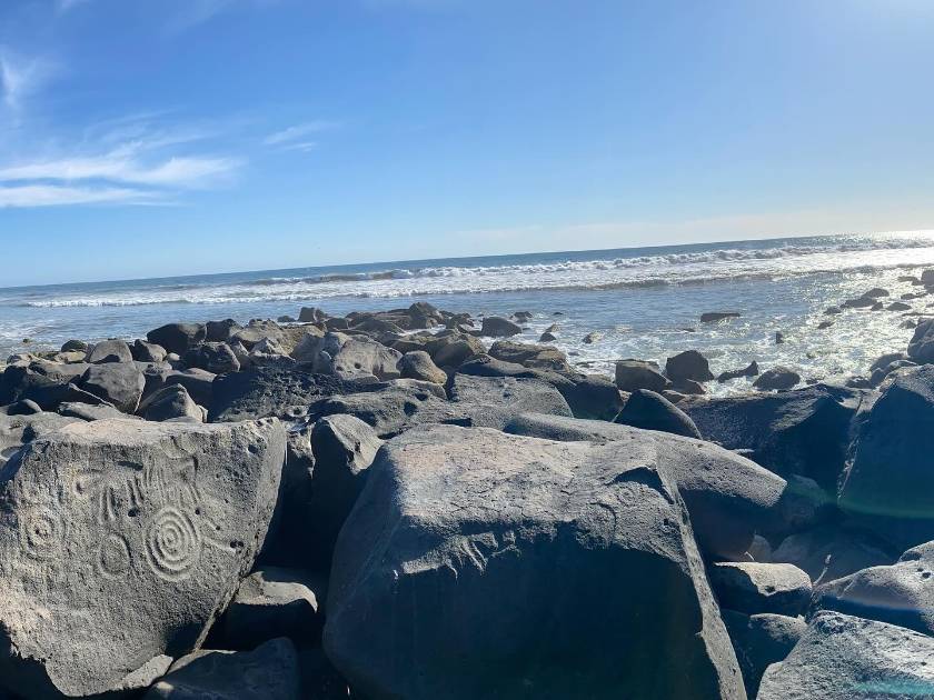 Este sitio alberga importantes vestigios prehispánicos grabados en piedra negra volcánica los cuales se encuentran cubriendo toda la costa.