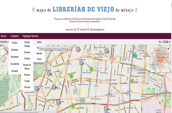 Carlos Gallardo, editor de la UAM y responsable del proyecto, señala que la idea es localizar en un mapa virtual (con geolocalización) todas las librerías de viejo que existen en el país, sin embargo, debido a que la plataforma fue creada en diciembre de 2015, por el momento sólo tienen el registro de las librerías de la capital, las cuales demuestran que su ubicación se relaciona a colonias con población de clase media económicamente hablando.