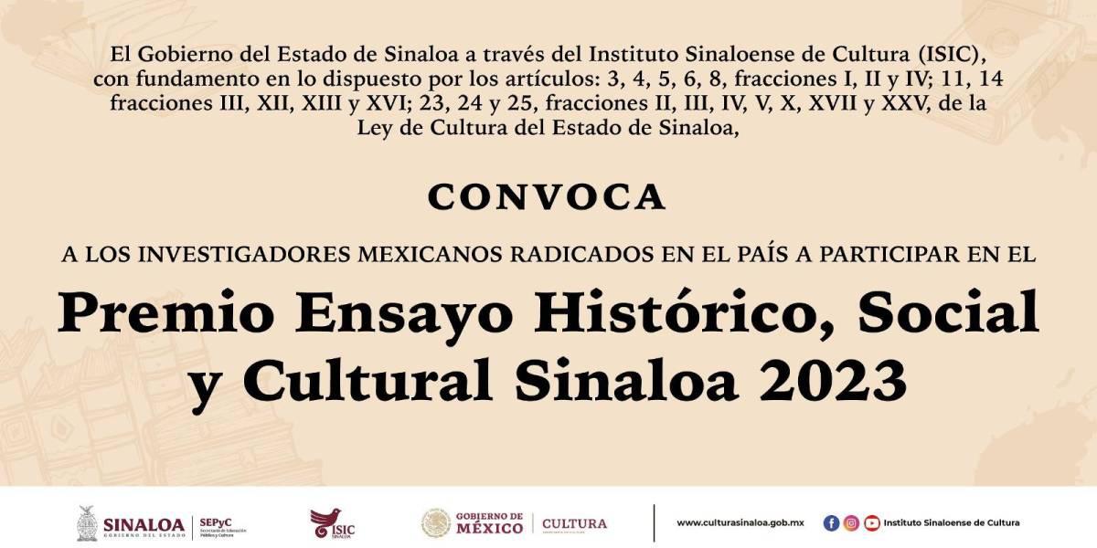 Solo quedan unos días, hasta este viernes 23 de junio de 2023, para que los investigadores mexicanos radicados en el país envíen sus trabajos al Premio de Ensayo Histórico, Social y Cultural Sinaloa 2023, convocado por el Instituto Sinaloense de Cultura.