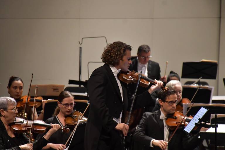 Olena se levanta con su violín e inicia la obligada afinación junto con el oboe que toca magistralmente Plamen Petcov, otro músico fundador. Un sonido de unidad, armonía y sonoridad da paso a la entrada al escenario del director, batuta en mano, los músicos se ponen de pie en señal de respeto y Alexandre Da Costa se muestra agradecido, sonriente por los aplausos del público, de inmediato se dispone a dirigir el concierto.