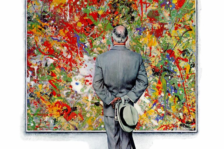 Un hombre vestido muy conservador, contempla muy de cerca el cuadro de Pollock, su lenguaje corporal es sugestivo. ¿Lo hace con interés y gusto? Acaso ¿Una fina ironía de Rockwell?