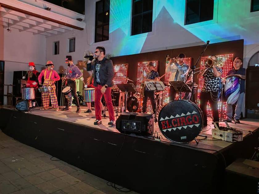 El evento tuvo lugar en el patio del recinto, con un juego de luces pero además, con una comparsa liderada por el grupo de cirqueros “MazaCircus”, quienes desde la entrada al recinto hicieron su aparición sorpresivamente llegando al escenario, donde el grupo ya se encontraba en posiciones para empezar.