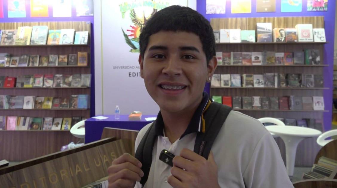 “Es interesante, no acostumbro a leer libros, pero me está pareciendo una buena exposición de libros. Que vengan a la feria, que lean, la verdad leyendo se aprende mucho, yo antes escribía muy feo y hablaba muy mal, mi léxico ha mejorado mucho, la forma en que te desenvuelves con las personas es mucho mejor. Lean libros de interés”, David Cruz, estudiante de la preparatoria Rubén Jaramillo.