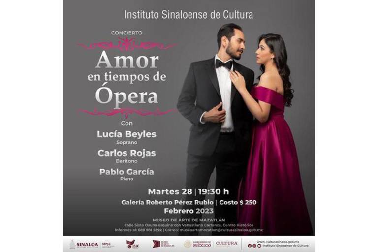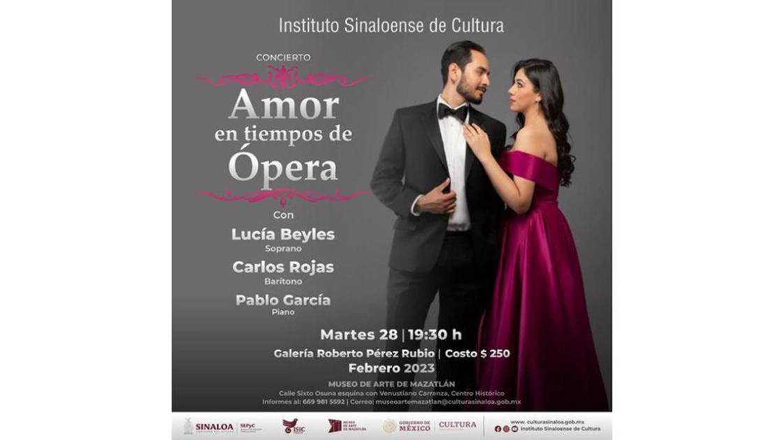 “Amor en tiempos de ópera”, se estrenará el próximo 28 de febrero a las 19:30 en la galería Roberto Pérez Rubio, organizado por el Instituto Sinaloense de Cultura, a través de su Delegación Sur en el Museo de Arte de Mazatlán.