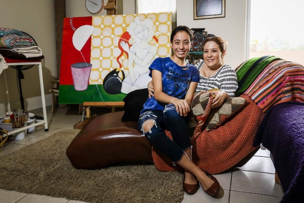 "Ser hija de artista es bien chilo", asegura María José Espinoza Garza, a sus 17 años."Toda tu vida tienes la oportunidad de rayar la banqueta, pintarte todo el cuerpo, rayar tu puerta, si sales con tu mamá y le dices quiero colorear, tiene plumones, pinceles, lápices, sacapuntas, borradores, brillitos, pegamento...".