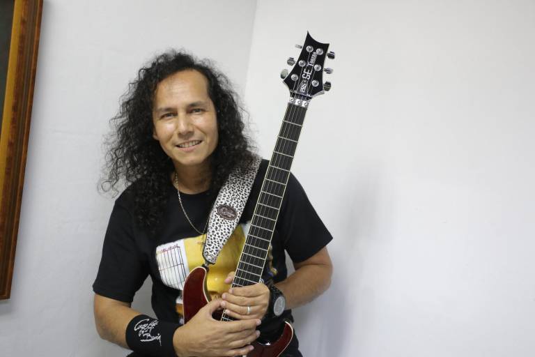 El guitarrista mazatleco posa con su guitarra, símbolo de más de 36 años de carrera musical y exploración del hard rock y géneros fusionados. ( ) -