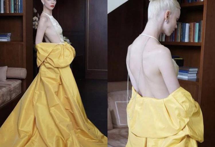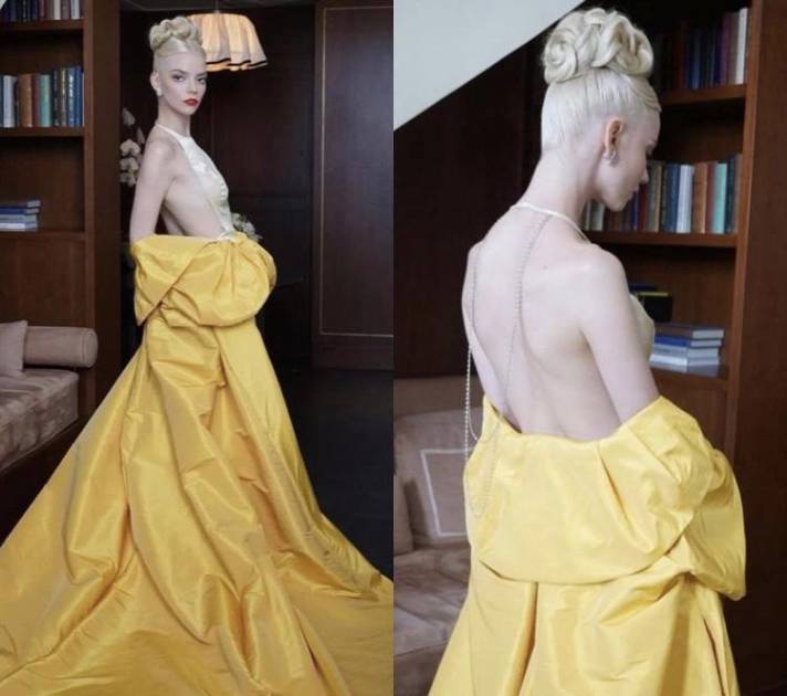 Anya usó esta creación con un cuerpo de color champán, ajustado y de escote que deja ver toda su espalda; sin embargo, el protagonista es el faldón amarillo que cae hasta sus pies.