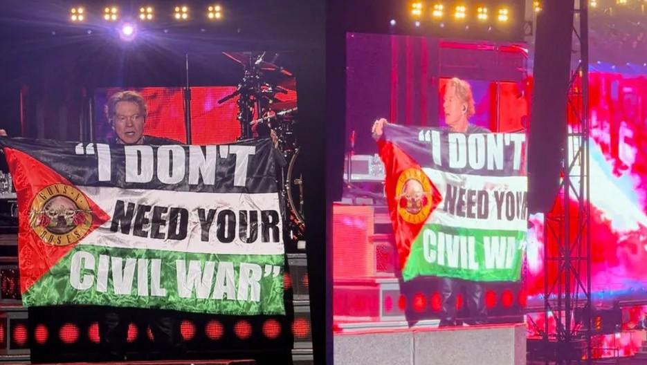 El momento más comentado de la noche llegó con Civil War, canción escrita por Rose contra los conflictos armados. Al finalizarla, el cantante pidió una bandera de Palestina que un fan le extendía entre el público con la frase “No necesito tu genocidio”.