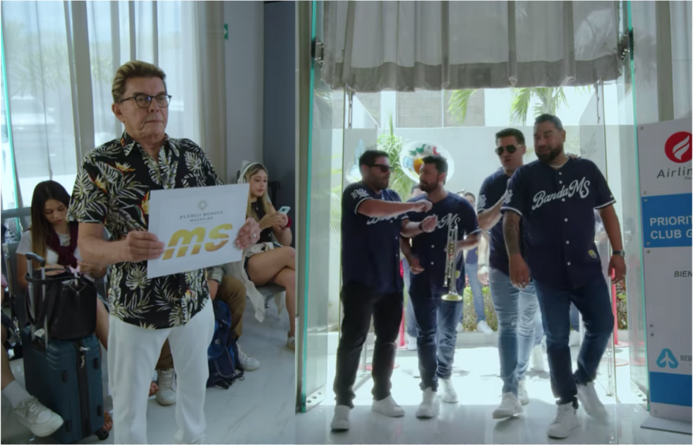 En el clip se puede escuchar de fondo a la banda interpretando el tradicional Corrido a Mazatlán, apareciendo en escena el empresario Ernesto Coppel, portando una carpeta con el nombre de la Banda MS, a su arribo al aeropuerto, apareciendo después los vocalistas Walo Silvas y Alán Ramírez, seguidos de Sergio Lizárraga, vestidos todos con jeans y casaca en color azul.