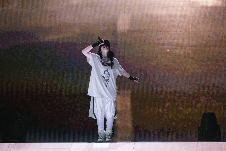 Música, percusiones graves, una danza de estrobos blancos y Billie Eilish saltó al escenario de playera, gorra, pantalones baggies y tenis para dar vida a Bury a Friend, tema con el que inició la velada.