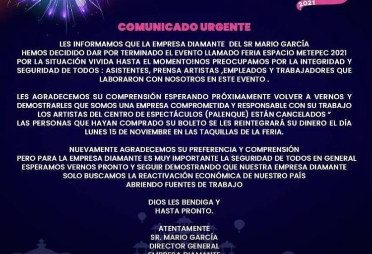 En el comunicado del equipo de Pancho Barraza se informa que la presentación programada para el viernes 5 de noviembre en el palenque Metepec quedaba pospuesta, ya que para el artista lo más importante es salvaguardar la seguridad del público y de su equipo de trabajo.