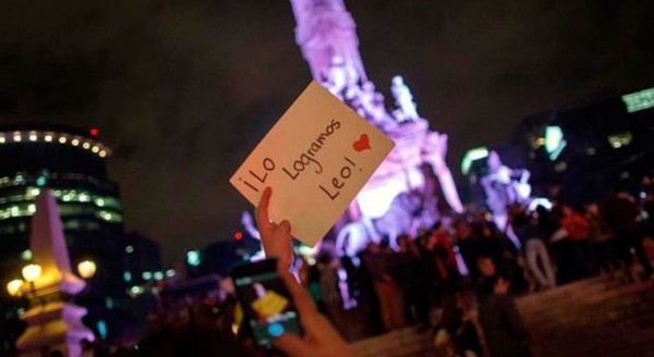 "Leo, hermano, ya eres mexicano", gritan en tono de broma alrededor de unas 100 personas que se reunieron en el monumento para celebrar la victoria del actor, quien después de cinco nominaciones ganó por fin la preciada estatuilla.