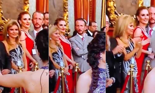 Dos veces él intenta tomarla del brazo mientras ella sonríe pero no cede ya que, según se aprecia en el video, prefiere guardar las apariencias pues sabe que están en público.